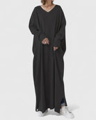 Deze jurk is ontworpen voor een moeiteloze dagelijkse stijl. Met een luchtige pasvorm en een minimalistisch ontwerp biedt de jurk comfort zonder in te leveren op elegantie. De V-hals en lange mouwen zorgen voor een tijdloze uitstraling die eenvoudig te combineren is met verschillende outfits en accessoires.