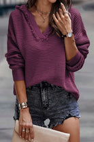 De Hooded Gebreide Trui is de perfecte balans tussen comfort en opvallende stijl. Gemaakt van een premium katoenmix met een geribde wafelbrei, biedt deze trui een boterzachte en ademende feel die je de hele dag comfortabel houdt. De diepe V-halslijn met versleten franjes voegt subtiele flair toe, terwijl de ruwe zoom van de capuchon een ontspannen esthetiek creëert. Met een oversized silhouet en een lichte, ademende drape is dit de ultieme go-to essential voor je garderobe.