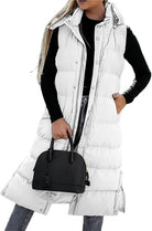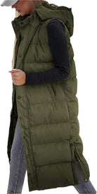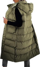 Model: Lange mouwloze gewatteerde bodywarmer met capuchon en zijsplitten