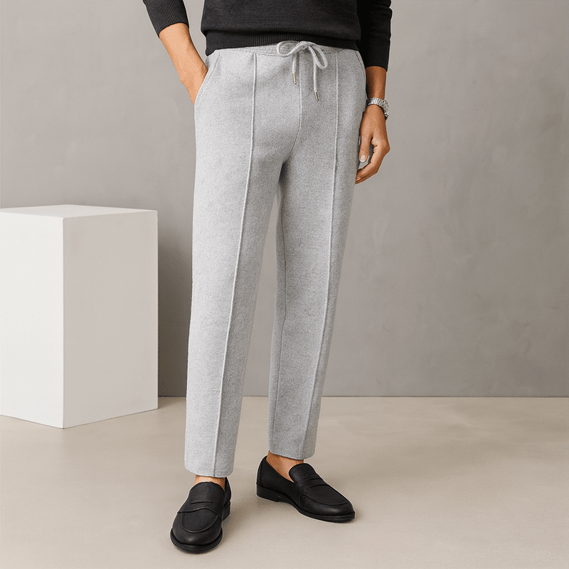 Ontworpen voor zowel ontspanning als casual gelegenheden, combineert deze kasjmieren broek voor heren draagcomfort met een verzorgde uitstraling. De zachte stof en de verfijnde pasvorm maken dit model geschikt om thuis te dragen of te combineren met andere kledingstukken voor een stijlvolle look.