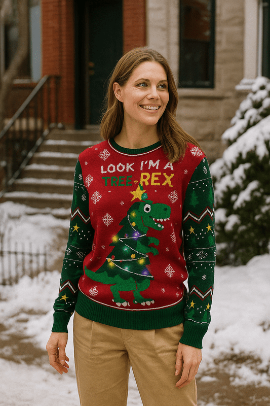 Deze unieke Unisex Ugly Christmas Sweater is perfect voor de feestdagen. Met een opvallend Tree-Rex ontwerp en meerkleurige LED-verlichting, brengt deze trui een vrolijke sfeer tijdens kerstvieringen.